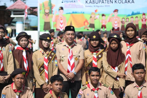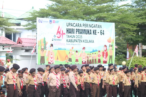 Kolaka – Bupati Kolaka H. Amri, S.STP.,M.Si memimpin upacara peringatan Hari Ulang Tahun (HUT) Pramuka ke-64 tingkat Kwartir Cabang (Kwarcab) Gerakan Pramuka Kabupaten Kolaka. Kamis, (14/08)